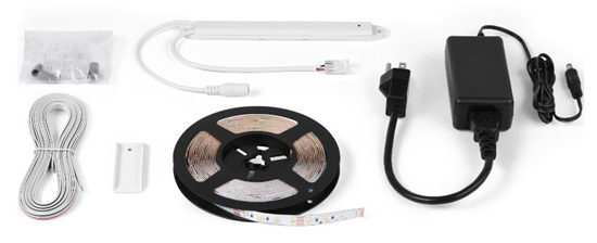 The LUT RRL-TLK-SW from Lutron is a complete Lumaris tunable white tape light solution kit that consists of field-cut tunable white tape, a wireless controller with integrated LED drivers, punch connectors, dedicated wiring, and a plug-in power supply.
